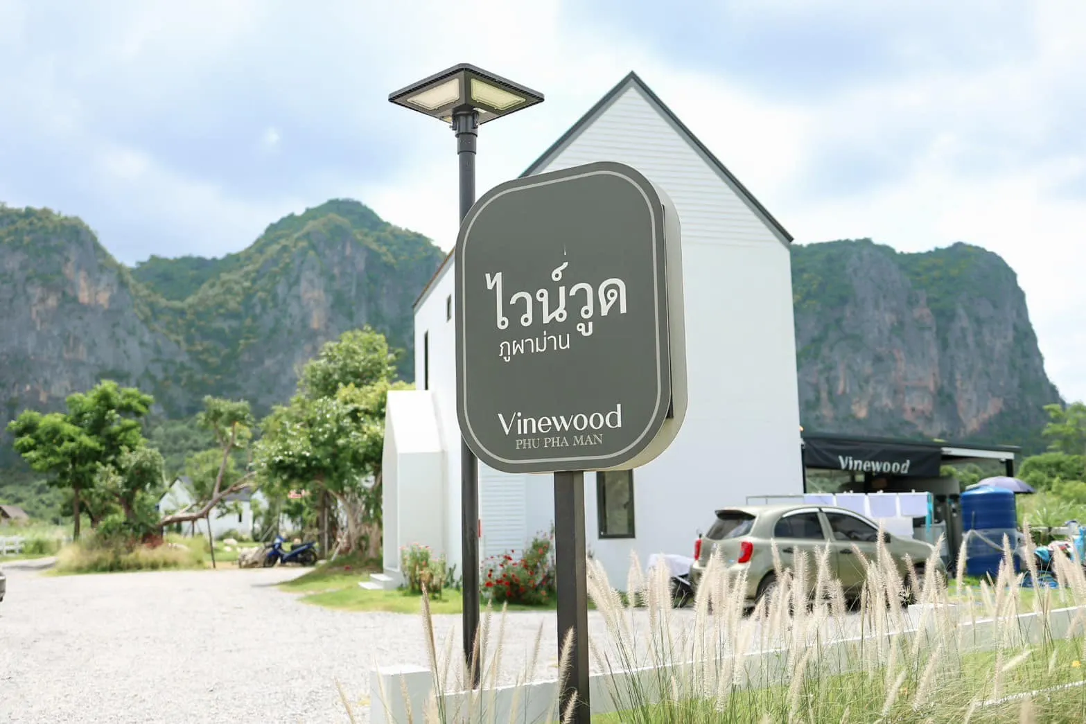 Vinewood Phu Pha Man เป็นที่พักที่ตั้งอยู่ใจกลางภูผาม่าน อยู่ท่ามกลางธรรมชาติและทุ่งนา สามารถเห็นวิวได้แบบพาโนรามา เป็นที่พักที่มีดีไซน์มินิมอล สีขาวเรียบง่าย โทนสีสะอาดตา นอกจากนั้นยังมีห้องแบบไม่มีอ่างและมีอ่างBubble Bath สำหรับคนที่อยากแช่ตัวชมวิวสบาย ๆ และมีบริการคาเฟ่ในที่พักเสิร์ฟกาแฟสด เบเกอรี่ และขนมอีกด้วย